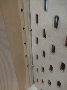 クローゼットを改造した工場エリアの 工具 を おしゃれ に ディスプレイ したい!そのためには、 有孔 ボード で壁面収納です。クローゼットに設置した作業台(IKEA製)なので、有孔ボードもIKEA製。サイズびったり!オプションの金具もたくさんありますので拡張性もばっちりです。